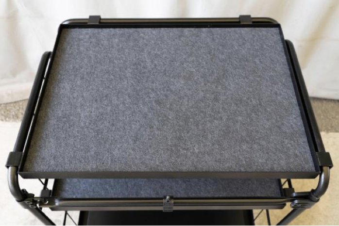 オプションの中間棚「プレミアムシェルフ」を取り付ければ、使い方の幅がぐっと広がります。天板だけでなく、台車の中間部分にも取り付けられるので、機材を分けて収納できて便利です。